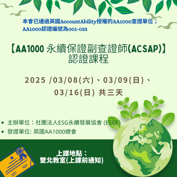 【AA1000】永續保證副查證師 (ACSAP)認證課程
